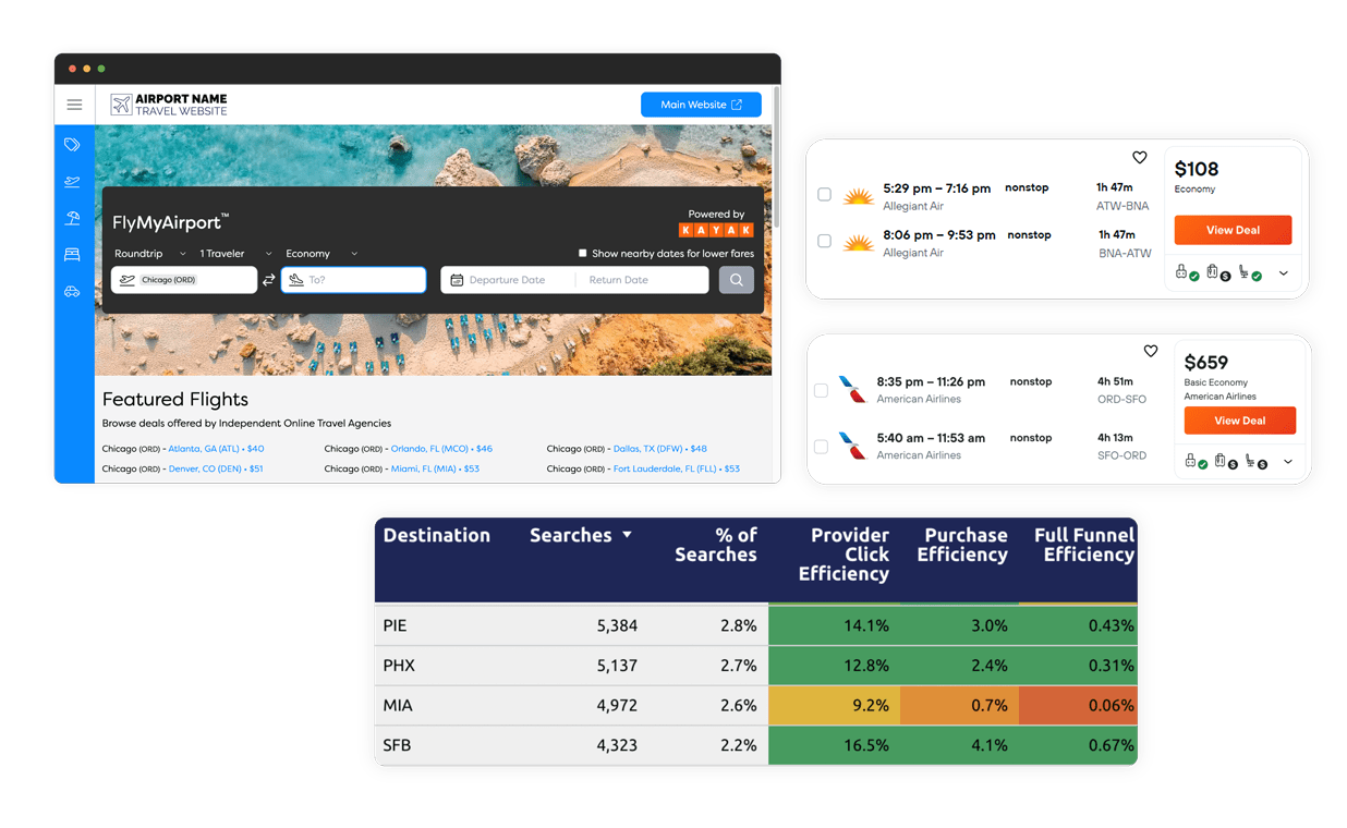 FlyMyAirport helps consumers find flights at your airport that align perfectly with their travel plan goals. It’s like your website greeting consumers with: “We understand your needs, and here are the best options our airport has to offer” earning repeat visits to your website.